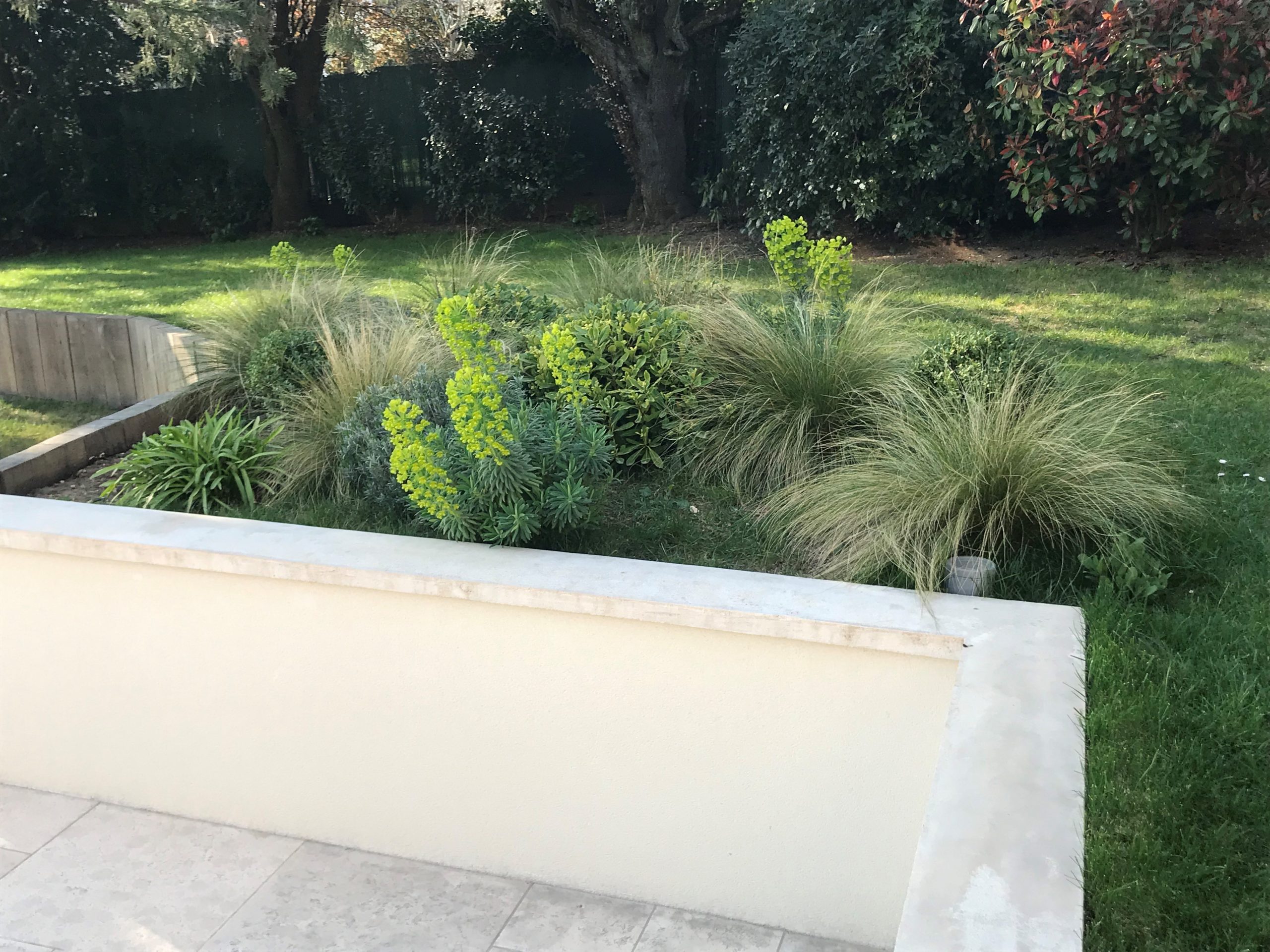 - Un massif plus important qui domine l’espace piscine et qui lui confère une ambiance plus naturelle (sauges, graminées, euphorbes…)