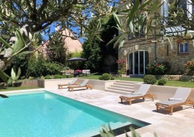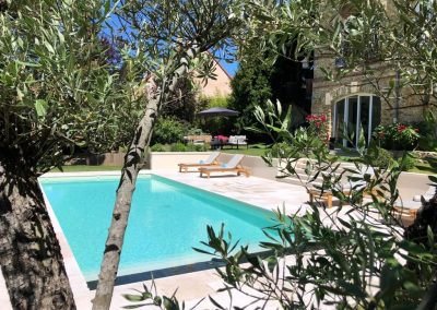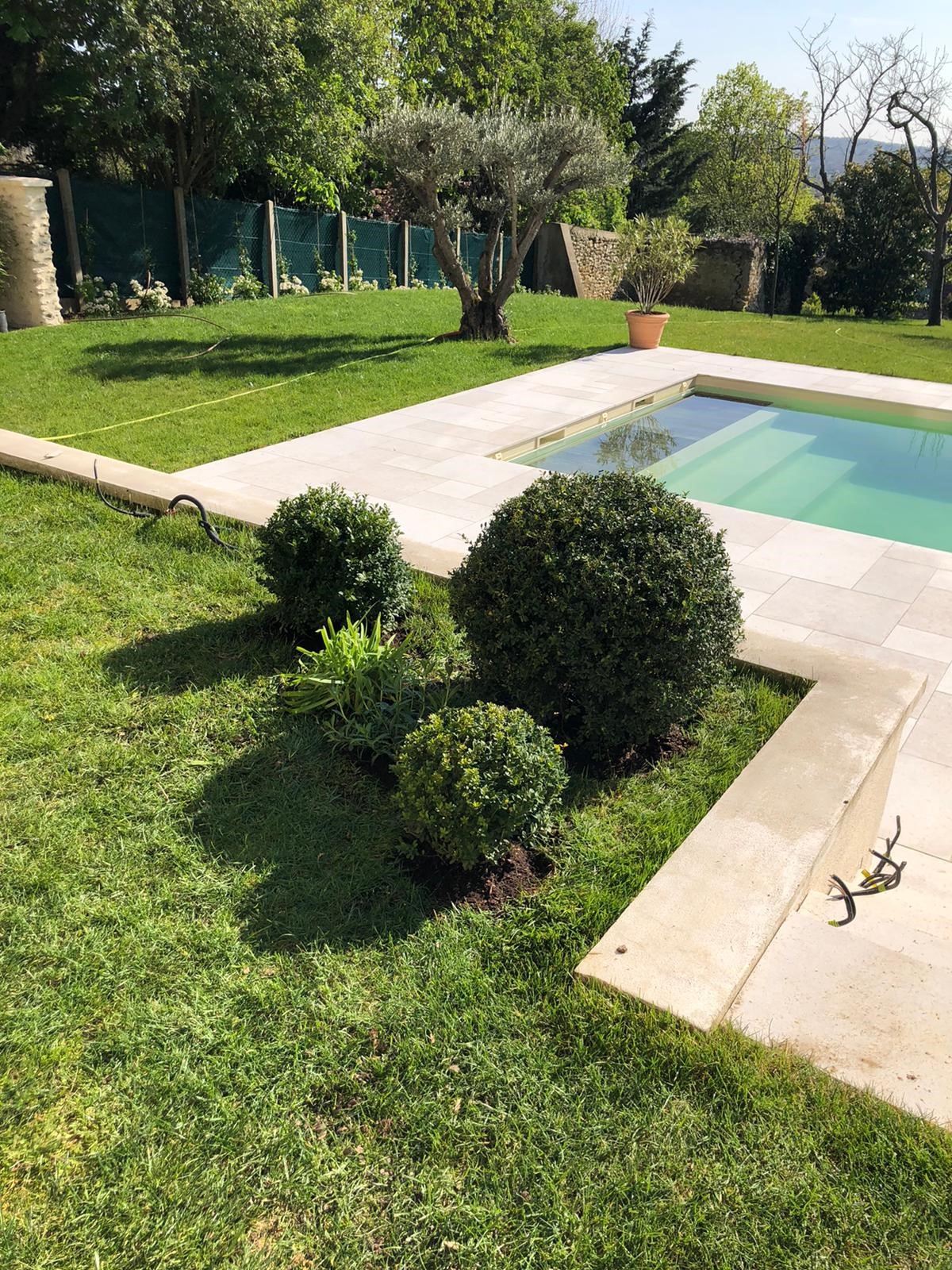 Après la création de la piscine, les propriétaires ont souhaité aménager tout autour: nous avons planté un olivier et créé 3 massifs.